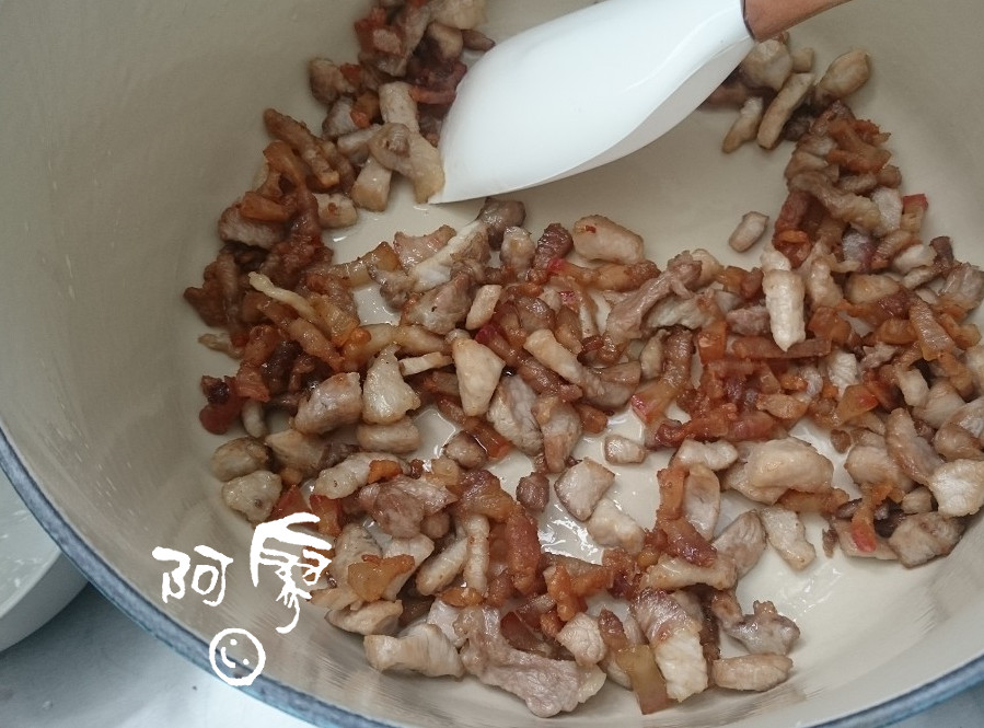 先將五花肉條分成油脂多與瘦肉兩個區塊,把油脂多的部分下鍋去炒,小火慢炒,把肉的腥味慢慢的炒出溫潤的豬油香。